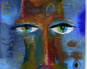 This kitty cat painting has so many colors and layers it is quite interesting. This cool cat looks bored, but isn't that the way of cats? Small, considered miniature art at 2.5 x 3.5 inches it is very special. I used a multitude of media, just about everything in my box of tricks to create this sweet cat. I can print him to be larger, a lovely high resolution giclee print, or you can buy the colorful original.